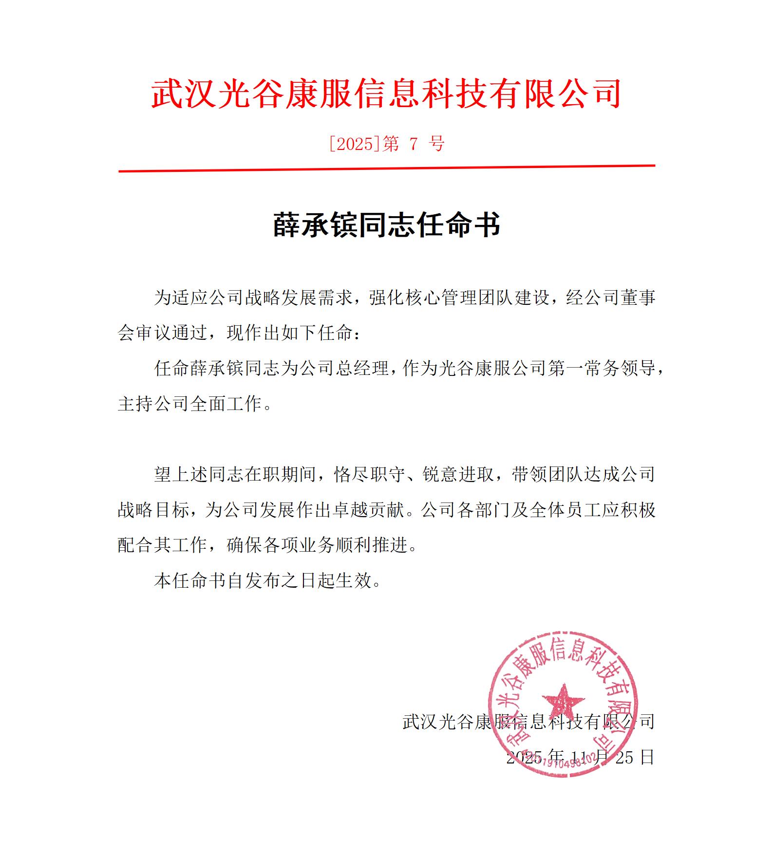 任命薛承镔同志为公司总经理,作为光谷康服公司第一常务领导,主持公司全面工作。