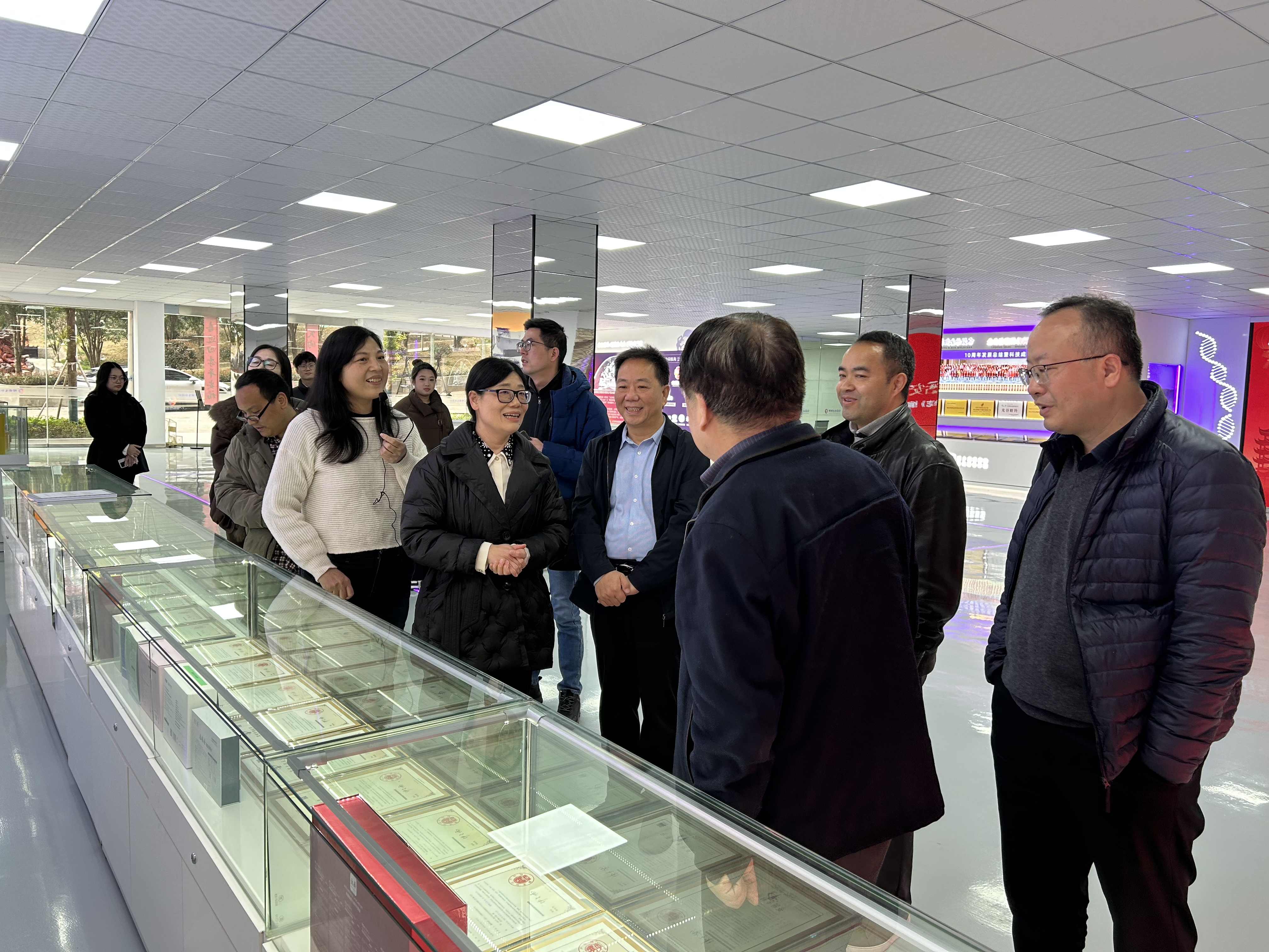 考察团首先参观了嫦娥生物股份展厅。在林国华董事长的引导下,专家们详细了解了公司的发展历程、核心产品矩阵及"研产供销"一体化产业布局,重点观摩了企业在平台建设、专利技术、科研成果以及社区健康服务模式等方面的创新成果,并对公司以科技创新驱动产业升级的实践表示高度关注。