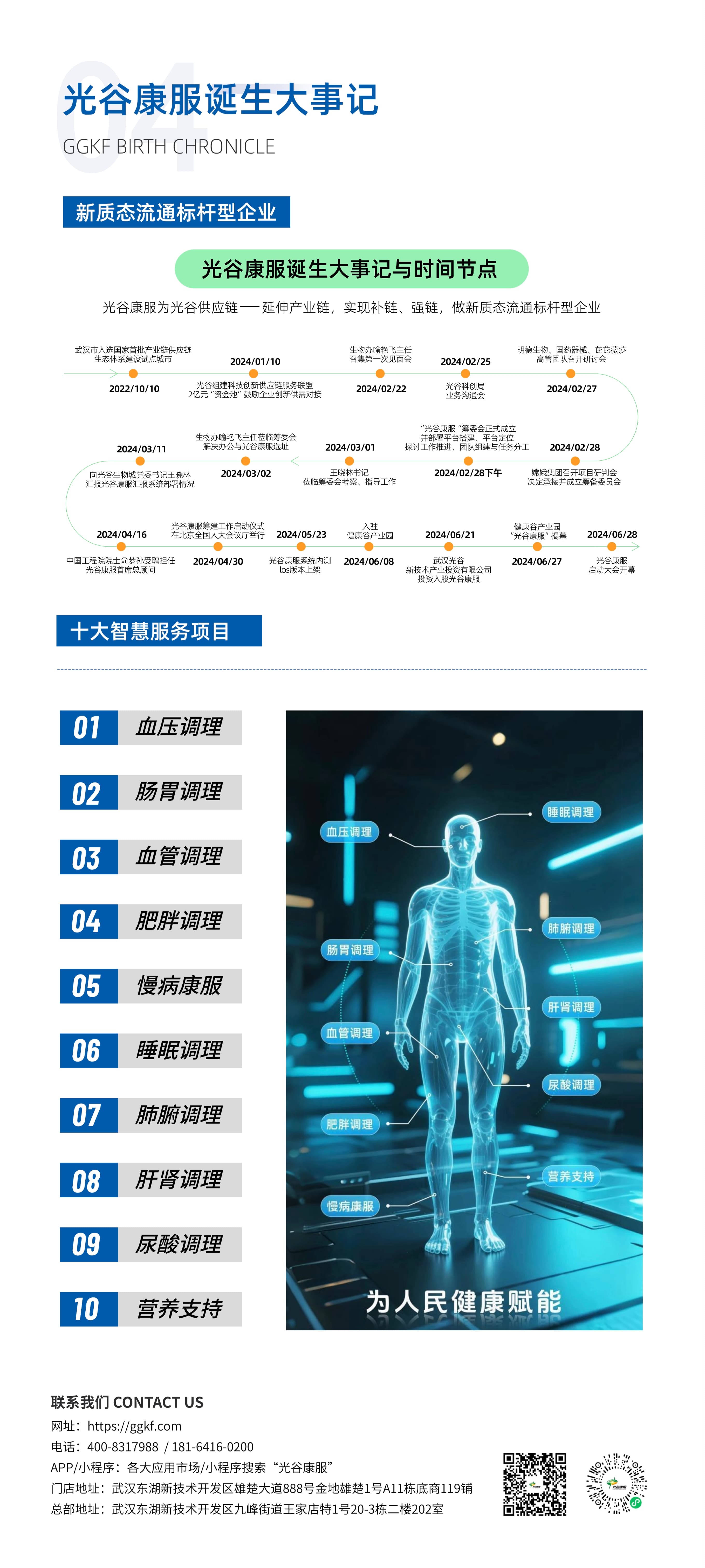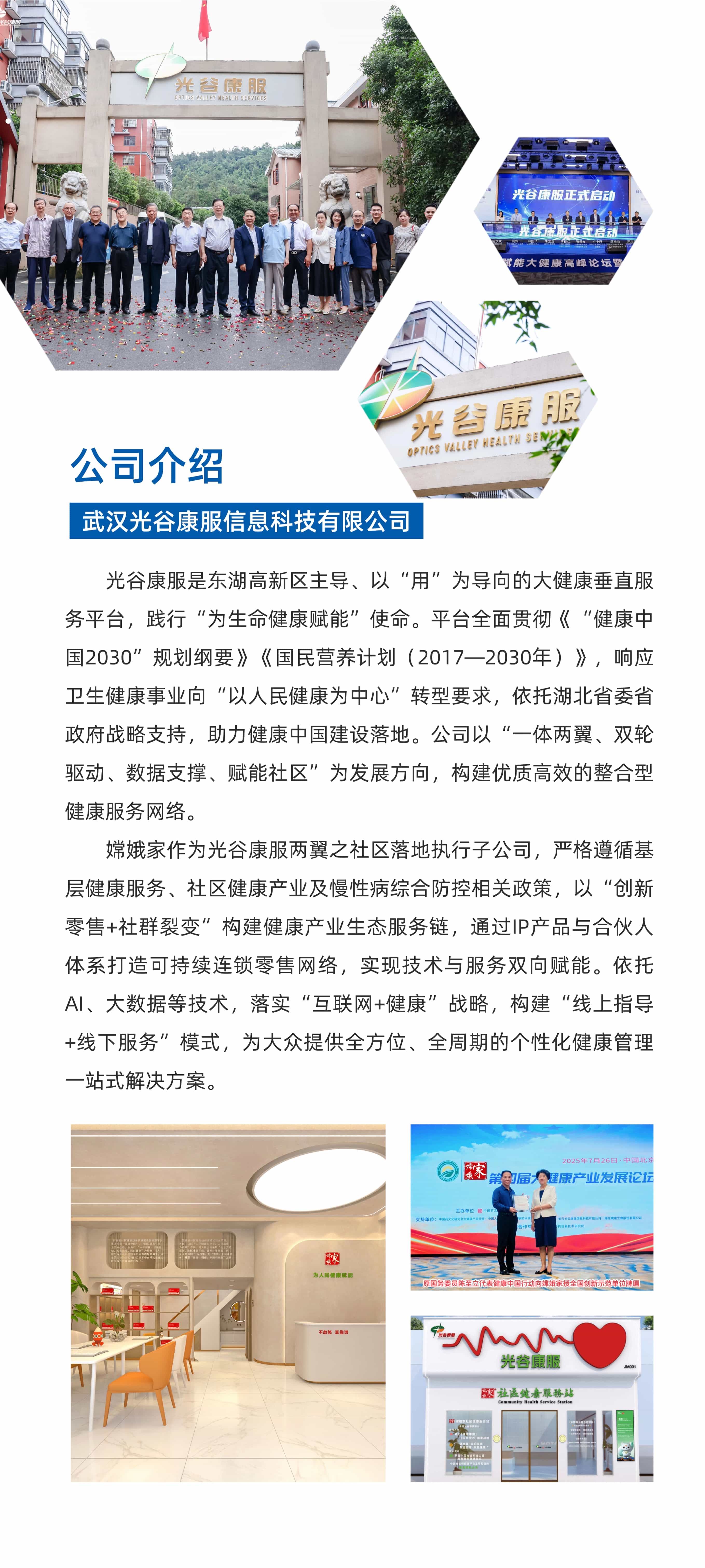 光谷康服作为嫦娥控股公司旗下的企业,是由东湖高新区主导建设的湖北省四大垂直服务平台之一。企业聚焦科创供应链的延链与补链,致力于打通“科技研发—市场应用”的关键链路,将前沿生物科技有效转化为普惠健康服务。秉持“为生命健康赋能”的使命,企业以“亲民之意、爱民之情、利民之心”为核心价值,着力打造新质态、赋能人民大健康的综合性垂类服务平台。