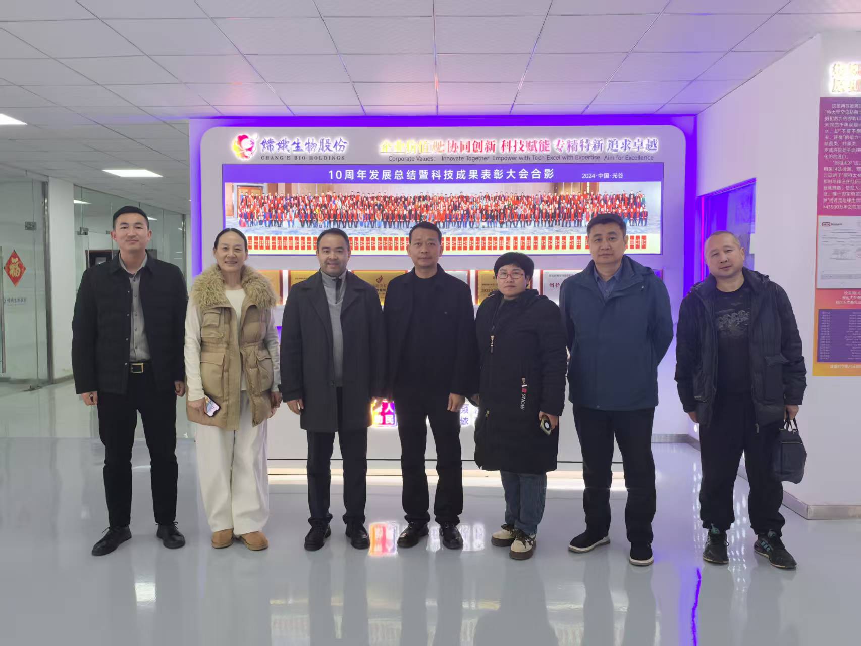 在嫦娥生物股份副总经理薛承镔、光谷康服首席药剂师耿建西等高层的陪同下,荣格科技代表团首先参观了公司企业展厅与荣誉墙。展厅讲解员系统介绍了嫦娥生物自成立以来的发展历程、核心技术布局、重大专利成果与“研产供销”一体化战略布局,生动阐释了公司“为生命力量赋能”的理念与实践,为双方进一步合作奠定了直观而坚实的基础。