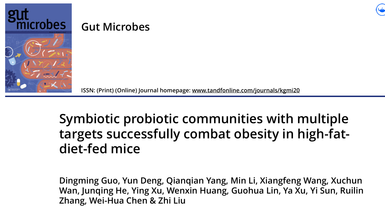 2024年11月3日,华中科技大学生命学院刘智教授团队在Gut microbes在线发表题为“Symbiotic probiotic communities with multiple targets successfully combat obesity in high-fat-diet-fed mice”的学术论文。