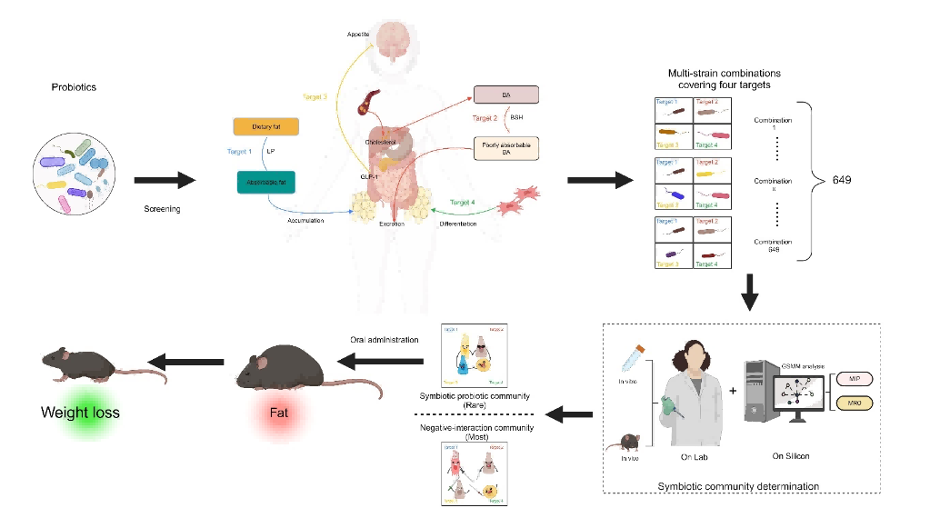 在过去几十年里,益生菌在治疗疾病方面效果显著。然而,具有高发病率和死亡率的肥胖是复杂且多因素的。多靶点益生菌组合可以在多个靶点上实现协同效应,提高疗效并减少副作用,有望在治疗多因素疾病时取得更好的治疗效果。但在自然群落中,细菌之间的负面相互作用占主导地位,两菌种互惠互利的合作关系则相对罕见。这一自然现象导致随机的多菌组合可能会因为负面相互作用而恶化治疗效果。因此,在进行多菌组合时,一定要充分考虑菌与菌之间的生态关系,设计可共生益生菌群落(SPC)以实现高效的疾病治疗。